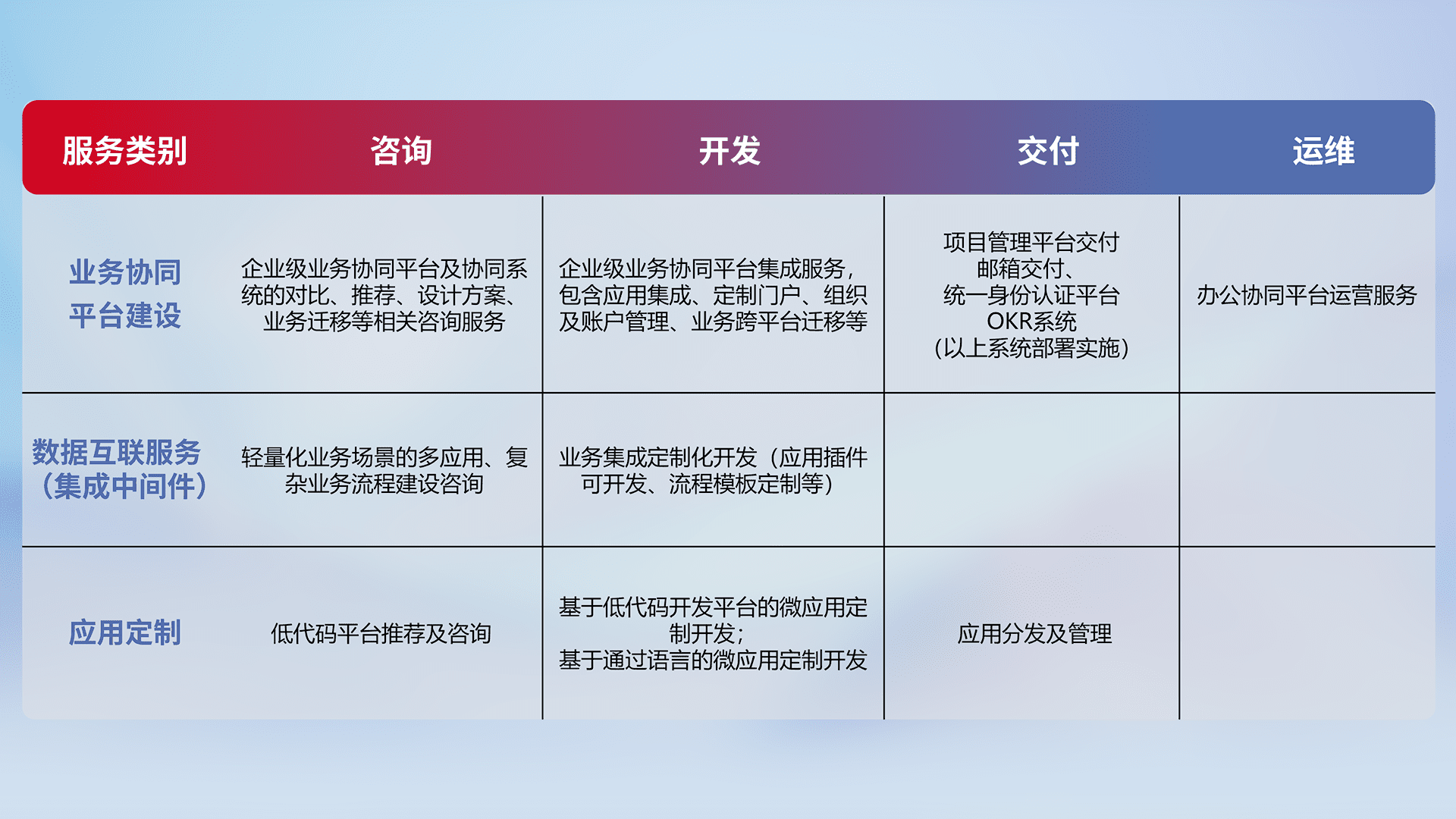 针对钉钉、、、企微、、、IDaas等平台级产品提供产品的规划、、方案、、交付、、定制化开发等服务,,,,实现如统一协同办公、、、、智能客户服务、、、混合会议管理、、、、智能数据查询、、、、等业务场景,,,,实现数字化转型。。。。