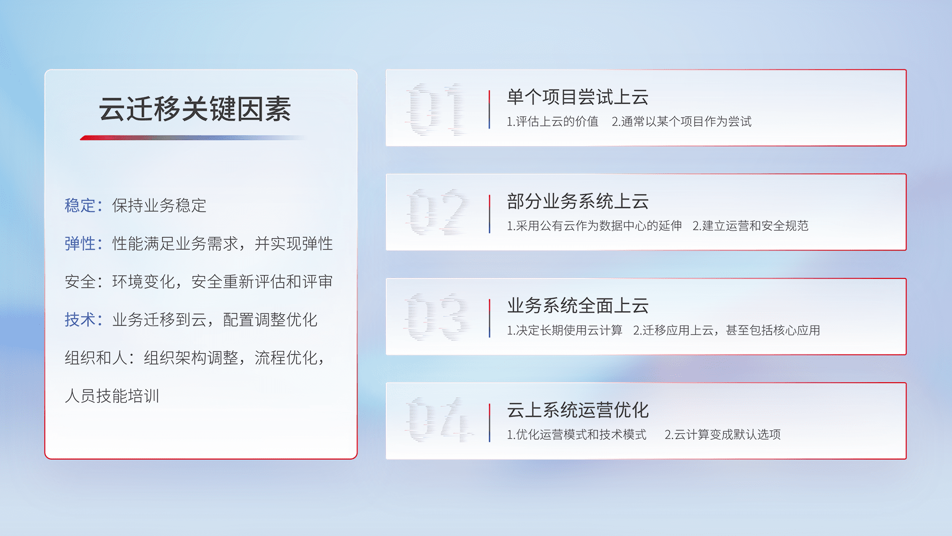 结合实际业务,,从规划设计、、、云平台选型、、、、云原生改造、、、、数据迁移、、、集成交付,,,,迁移全过程为客户识别最佳上云路径,,,,做好风险识别管理,,,设计网络架构、、身份权限、、、安全审计合规、、、操作审计、、日志审计、、、、监控告警策略、、、多站点容灾设计等,,对云上基础设施进行整体规划,,,,提升IT治理水平,,,,以满足弹性、、高可用、、高性能的需求。。。