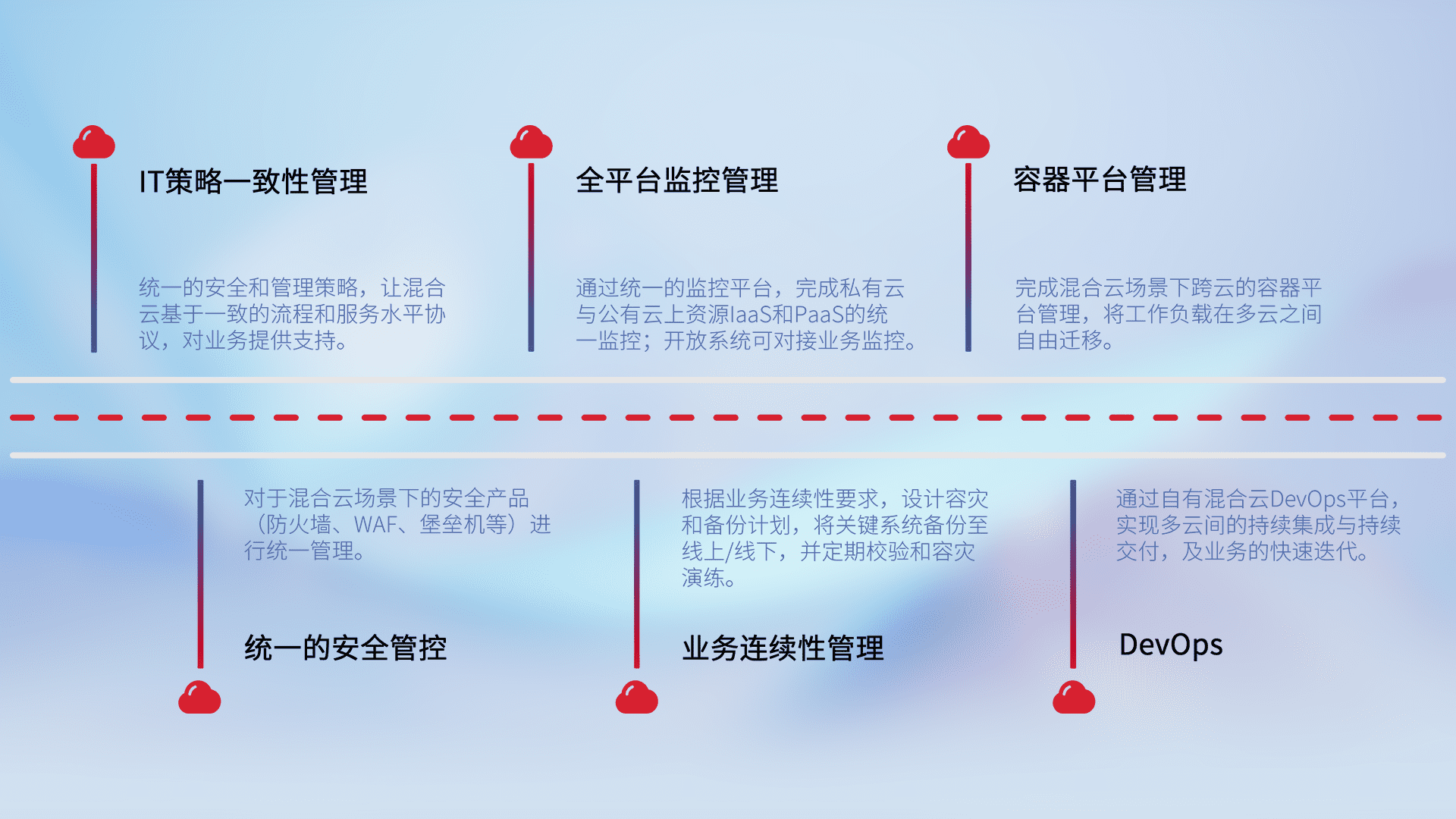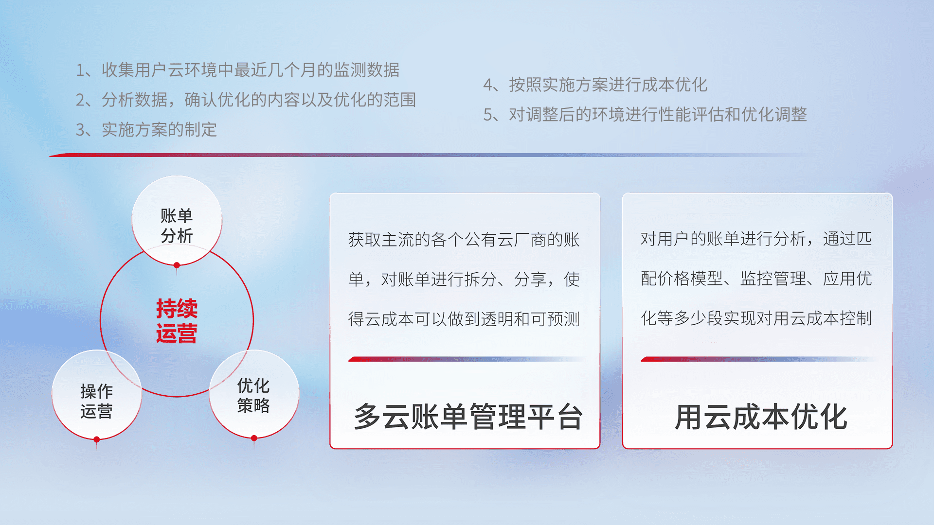 通过多云纳管,,以统一的资源数据模型把客户的云资源进行抽象和封装,,,,进而实现对多云资源的统一操作,,,,保障云资源管理的可靠性、、、、稳定性与可用性。。量身定制化运维内容,,,配置、、开发运维、、、补丁管理、、备份、、、监控、、、、认证和访问管理、、、、审计和日常巡检等,,,,保障在用云过程中的可靠度,,,稳定度以及高可用率。。。